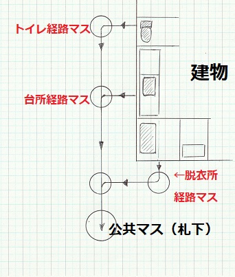 戸建て住宅の場合、トイレは単独経路で家の外に出てきて排水マスが設置され、台所排水も単独で家の外に出てきて排水マスが設置されていることが多くなります。