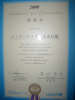 ユニセフ国際連合児童基金より連名で感謝状をいただきました。