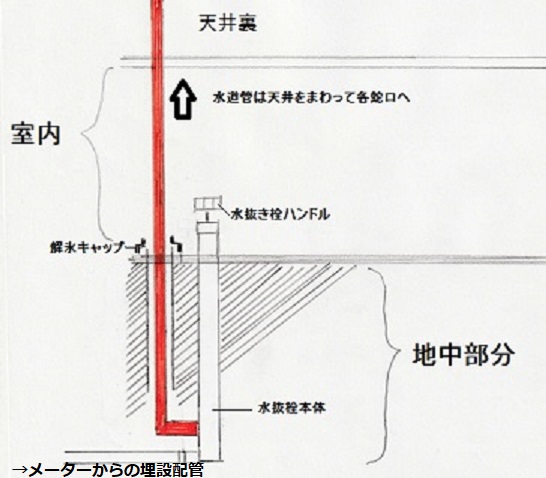 図の赤い配管ラインから上が室内に通る水道管になります。