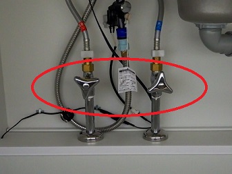 上の画像の赤丸の箇所は、右手が水側、左手がお湯側配管の止水バルブです。