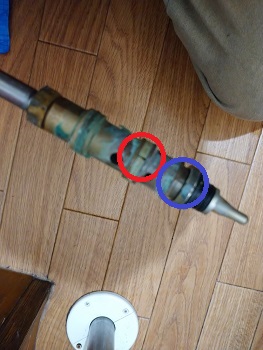 ピストン部分を確認すると、画像の赤丸箇所のパッキンは切れ目が入っており、となりの青丸箇所のパッキンは劣化しすぎて完全になくなってしまっています。