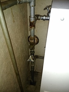 ボイラー設置部の横の狭いスペースに水道が立ち上がり、その経路に取り付けられている減圧弁という器具からの腐食水漏れでした。