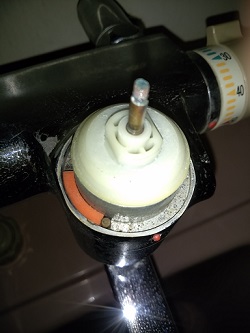 今回は定量止水ハンドル内部のカートリッジを交換し、正常にお湯が自動的に止まるように改善することができました。