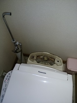 お客さまのほうでトイレタンクの手洗い箇所のフタを開けてみたところ、タンクの中でプラスチックの部品が折れてしまっているようだというお話をいただいてお伺いしました。